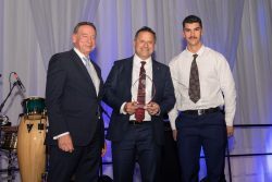 APPEA Excellence Awards MC and former Cooper Energy CEO David Maxwell, left, presents the award to ExxonMobil Australia chairman Dylan Pugh, centre, and apprentice Thomas Mutimer