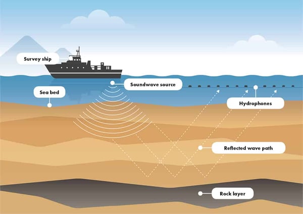 A marine seismic survey is a method of determining geological features below the sea floor, using a technical process which involves sending sound waves into the rock layers beneath the sea floor and then recording the time is takes for each wave to bounce back as well as measuring the strength of each returning wave. It is the most reliable form of initial exploration for oil and gas and is an essential process in identifying geological features that could contain oil or gas deposits.