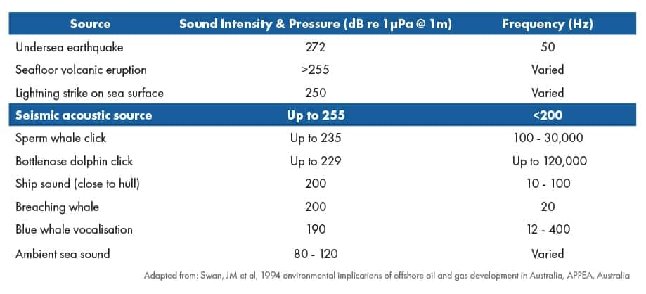 The noise generated by marine seismic surveys is analogous to many naturally occurring marine sounds including those made by some animals themselves. For example, a sperm whale click has a sound intensity and pressure in the same range of a seismic acoustic source. We’ve provided a breakdown below: