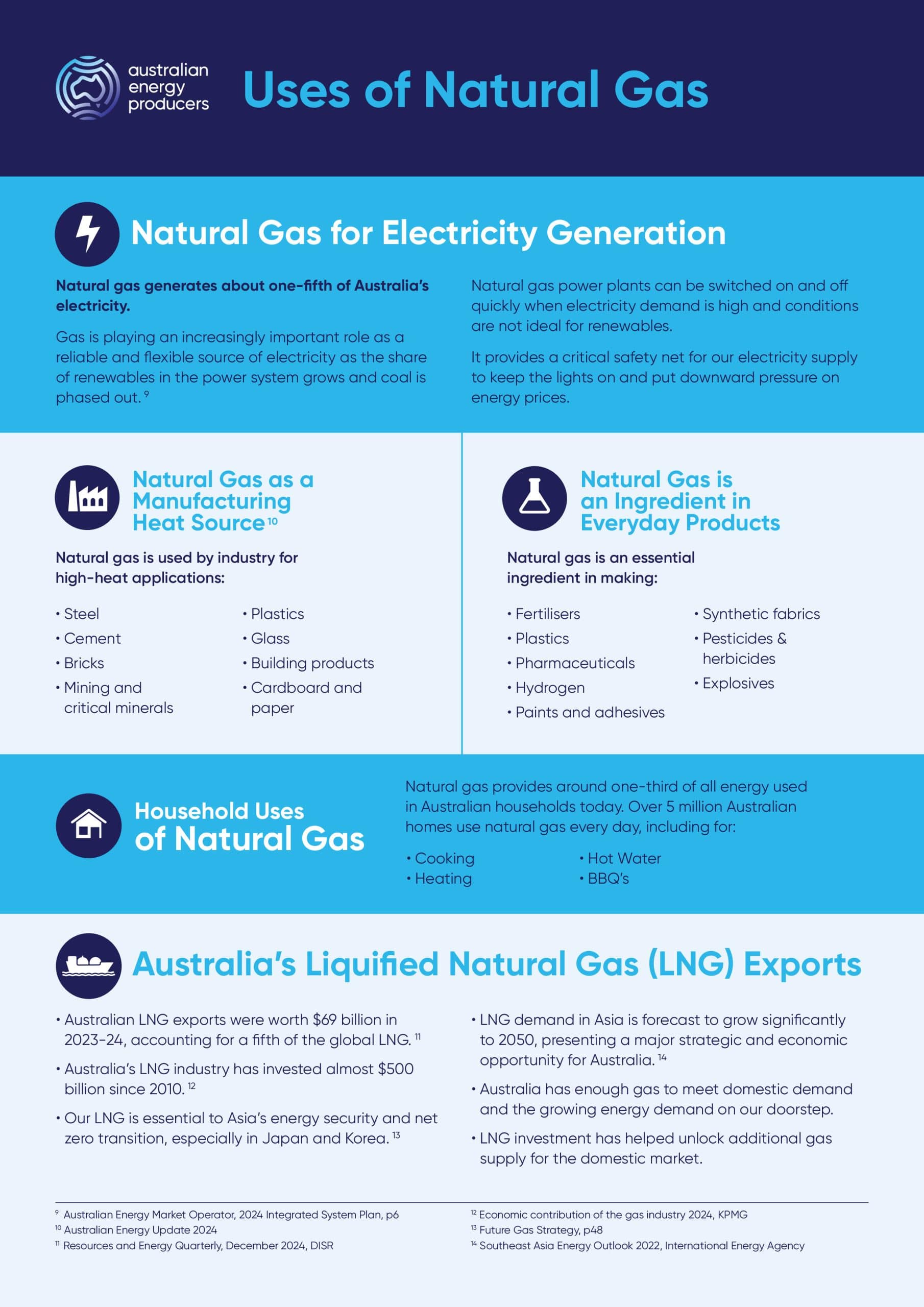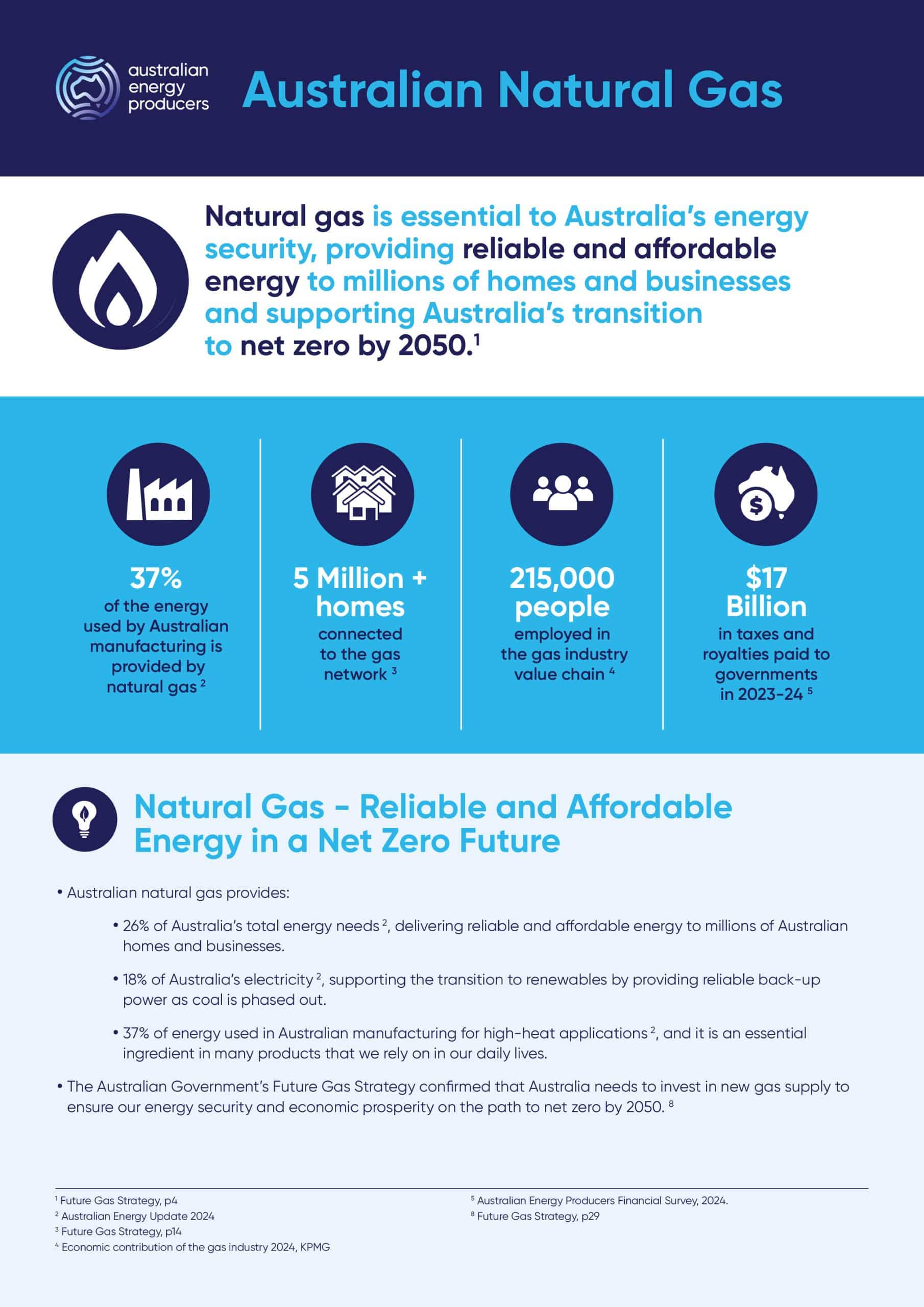 Natural gas is essential to Australia’s energy security, providing reliable and affordable energy to millions of homes and businesses and supporting Australia’s transition to net zero by 2050. Download Fact Sheet Share This Share: facebook-f icon linkedin-in icon twitter icon pinterest-p icon envelope icon Fact Sheets